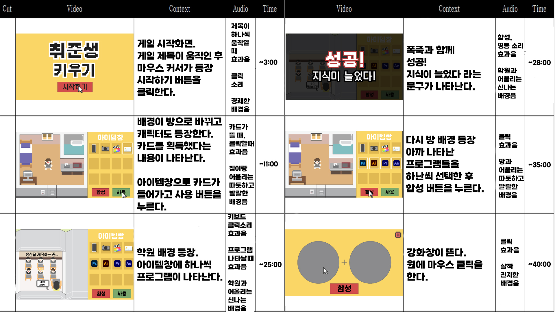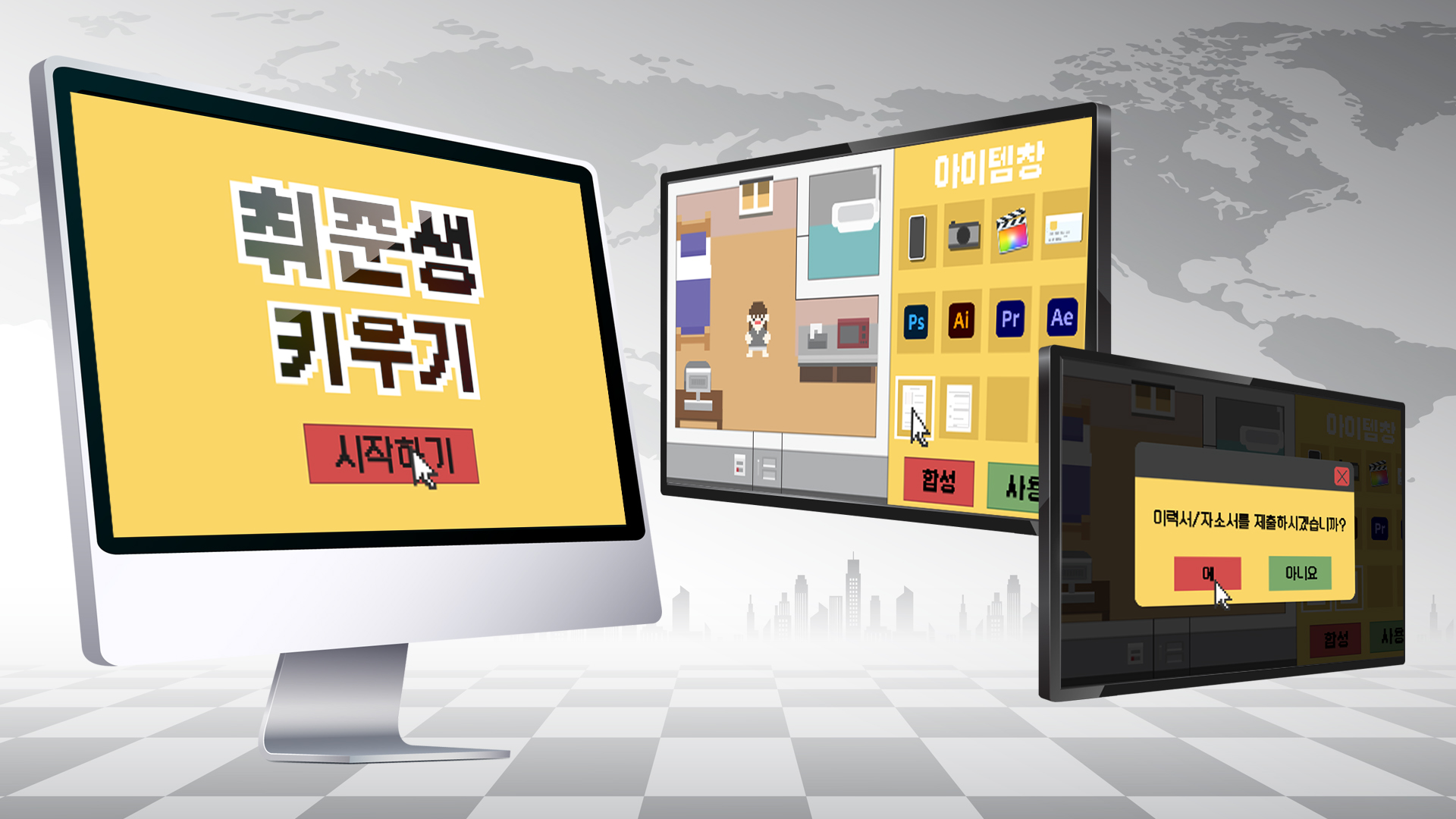 비전공자의 우당탕탕 성장기!!! 취미는? 카메라로 사진찍기, 파이널컷으로 간단한 영상편집을 할 수 있었던 나는 국민취업제도를 알게되었고 내일배움카드를 카드를 획득하게되며 학원을 다니게 된다. 열심히 다니며 포토샵, 일러스트, 프리미어프로, 에프터이펙트에 대한 지식을 획득하게 된 나는 원래부터 있던 아이템들과 조합하여 여러가지 결과물을 만들어내며 성장을 한다. 한층 더 업그레이드 된 브이로그와 짐벌을 사용한 영상들, 간단한 에프터이펙트 모작과 포스터/일러스트로 제작 한 포스터 모작까지! 강화창을 닫으니 나타나는 이력서와 자기소개서. 과연 나는 취업을 할 수 있을까??